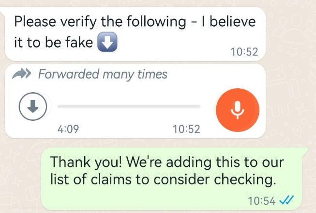 So stop for a second and think about what you are sharing. In some cases, this could be the difference between a voice note with false information only reaching one other person, or being forwarded to thousands of recipients on WhatsApp before a fact-check is written.
